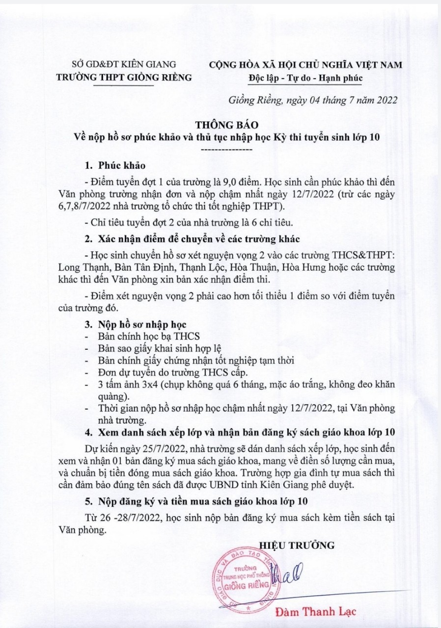 DANH SÁCH TRÚ TUYỂN KỲ THI TUYỂN SINH VÀO LỚP 10 TRƯỜNG THPT GIỒNG RIỀNG