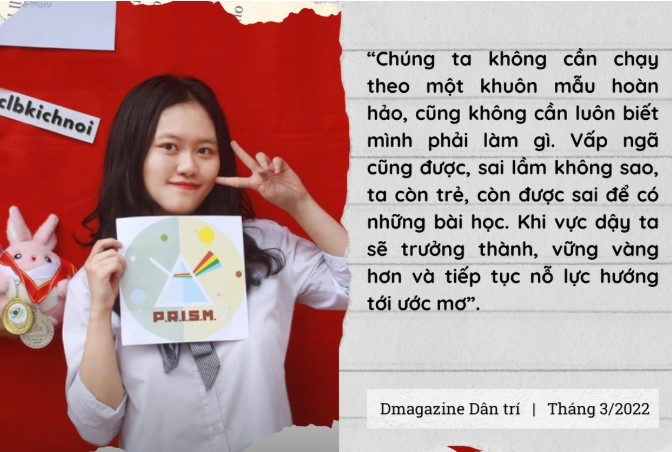 Con đường em theo đuổi mới chỉ bắt đầu. Bản thân em vẫn còn nhiều thiếu sót cũng như nhiều điều cần học hỏi và trải nghiệm. Em tự tin rằng mình sẽ luôn cố gắng không ngừng và quyết tâm theo đuổi đam mê nghiên cứu khoa học mà mình hằng ấp ủ. Với em, đó chính là phẩm chất quan trọng nhất mà một người đại diện cho thế hệ trẻ Việt Nam cần có".