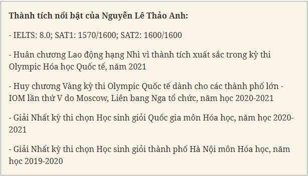 Nguyễn Lê Thảo Anh đã học 7 năm ở trường chuyên. Cựu nữ sinh trường THPT chuyên Hà Nội - Amsterdam tâm sự: "Em được biết rất nhiều cá nhân vô cùng xuất sắc trong rất nhiều lĩnh vực. Thậm chí, ngay trong chính môn Hóa sở trường, em cũng không phải là người hiểu nhanh nhất. Qua trải nghiệm, em hiểu điều quan trọng là mỗi người đều có tốc độ riêng. Học thuật là cuộc đua đường dài, quan trọng là biết rõ tốc độ bản thân và kiên trì đi đến cuối cùng. Nếu em nhìn vào người khác để làm tấm gương phản chiếu chính mình, thì có lẽ em sẽ chẳng thể nào tận hưởng được hết khoảng thời gian ở "Ams" như em đã làm trong 7 năm qua.