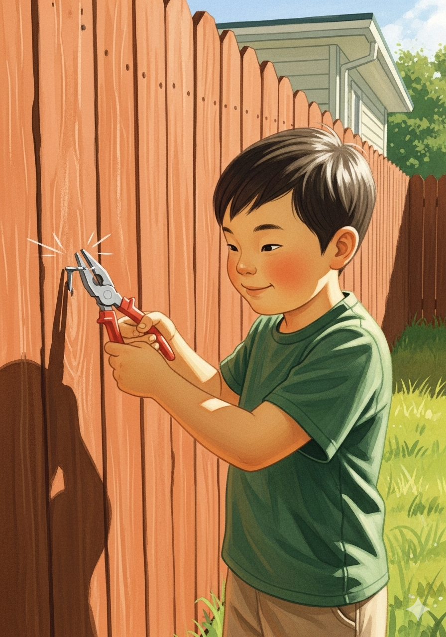 Hàng rào rất kiên cố, chiếc búa rất nặng, thế nhưng cậu bé vẫn đóng tổng cộng 37 cái đinh trong ngày đầu tiên – cậu đã nổi giận rất nhiều lần.