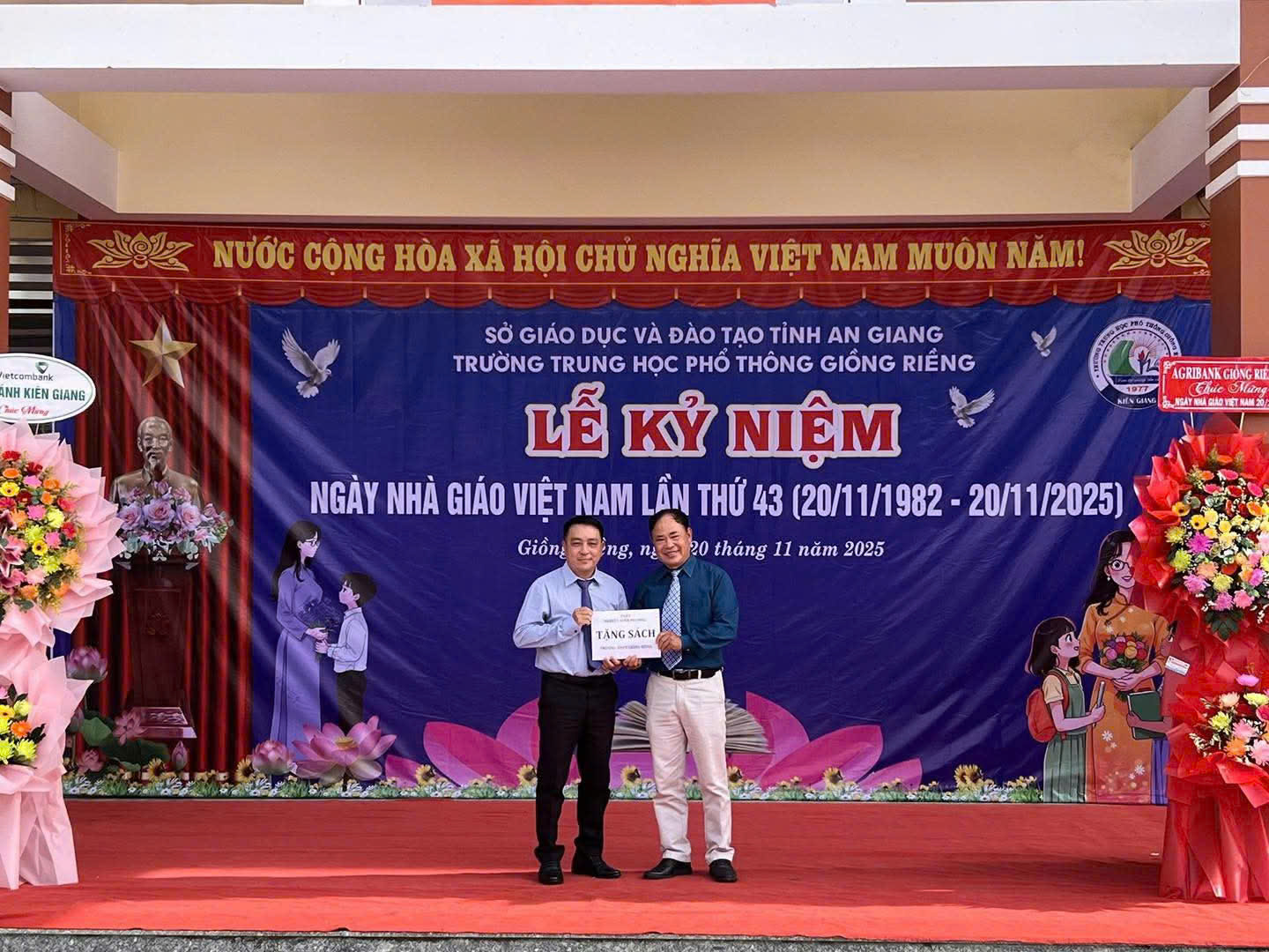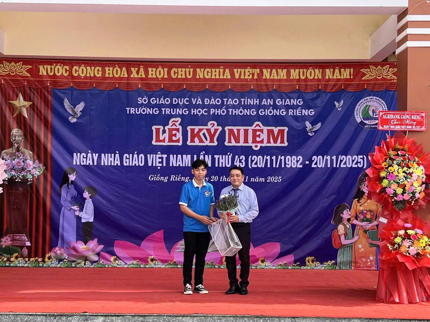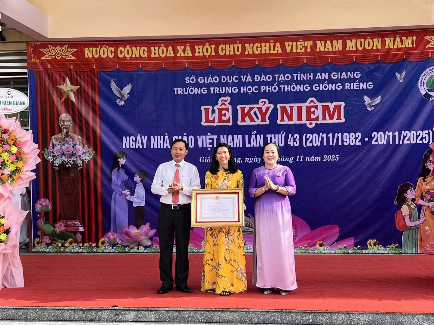 Sáng ngày 20/11/2025, trường THPT Giồng Riềng đã long trọng tổ chức Lễ kỷ niệm 43 năm ngày Nhà giáo Việt Nam (20/11/1982 – 20/11/2025). Dự có đồng chí Đặng Quốc Cần - Ủy viên Ban thường vụ Đảng ủy, Phó Chủ tịch UBND xã Giồng Riềng kiêm Giám đốc Trung tâm phục vụ hành chính công xã, các ban ngành, nguyên lãnh đạo huyện Giồng Riềng, Ban đại diện cha mẹ học sinh, các thế hệ cựu giáo viên, học sinh, các nhà tài trợ, mạnh thường quân cùng toàn thể cán bộ, giáo viên và gần 1.500 em học sinh. Tại buổi lễ, thầy Đàm Thanh Lạc - Hiệu trưởng nhà trường đã ôn lại truyền thống tôn sư trọng đạo và báo cáo tóm tắt các hoạt động nổi bật từ đầu năm học. Theo đó, hướng tới kỷ niệm ngày Nhà giáo Việt Nam 20/11 năm nay, Trường THPT Giồng Riềng đã phát động thi đua đạt thành tích đạt gần 1.000 điểm tốt dâng tặng thầy cô. Có gần 100 học sinh đang tích cực ôn luyện cho kỳ thi học sinh giỏi cấp Tỉnh. Vận động xe đạp, tập sách và học bổng với tổng trị giá trên 200 triệu đồng hỗ trợ cho các em học sinh có hoàn cảnh khó khăn. Đặc biệt, nhà trường có 01 giáo viên vinh dự được tuyên dương tại Đại hội thi đua yêu nước tỉnh An Giang lần thứ I… Dịp này, 01 cá nhân nhận Huân chương Lao động hạng Ba đã có thành tích xuất sắc trong công tác, góp phần vào sự nghiệp xây dựng chủ nghĩa xã hội và bảo vệ Tổ Quốc; 03 cá nhân nhận Bằng khen của Thủ tướng Chính phủ đã có thành tích trong công tác giáo dục và đào tạo từ năm học 2019-2020 đến năm học 2023-2024, góp phần vào sự nghiệp xây dựng chủ nghĩa xã hội và bảo vệ Tổ Quốc.